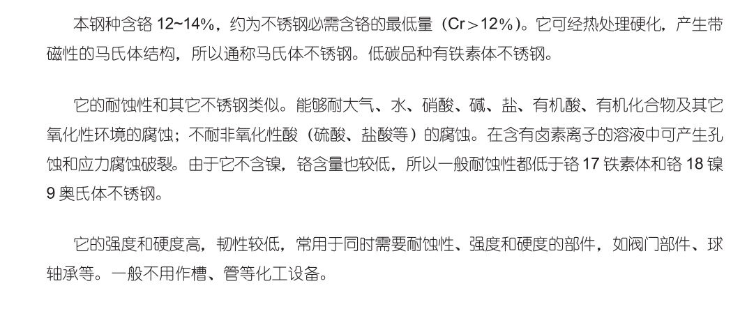 不锈钢是铬、镍含量较高的合金钢。通常把耐大气腐蚀的合金钢称为不锈钢,把在酸中及其它强腐蚀性介质中耐腐蚀的合金钢称为耐酸钢。一般把上述不锈钢与耐酸钢统称为不锈耐酸钢或简称为不锈钢。